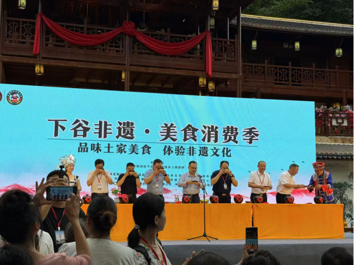 接着林小幔老师带大家到神农架下谷坪土家族乡非遗美食消费季现场,1000多位游客相聚于此,感受当地传统非遗的魅力。这个小乡村常住人口只有4000多人,可这里竟然有唐戏、皮影戏、薅草锣鼓、土家八大碗等4个省级非遗。唐戏非遗传承人胡运坚守传承20年,背后有着动人故事。她回忆,早年没钱购买戏服,师傅就用被单床单缝制服装给学员穿,这件戏服已在农博馆悬挂了20年,无论搬迁到哪里她都会随身携带,师傅的精神始终激励着她坚持传承唐戏。
