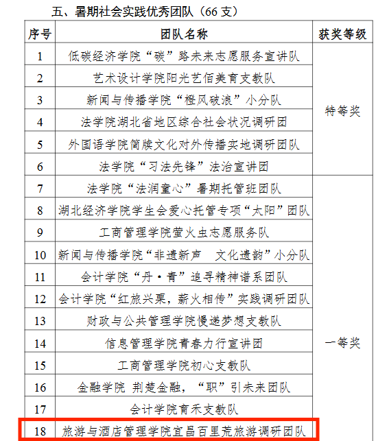 “宜昌百里荒旅游调研团队”(团队编号:F010)在指导老师于凡、付睿思的带领下,深入湖北省宜昌市开展旅游调研。团队荣获“暑期社会实践优秀团队一等奖”,撰写的调研报告荣获“优秀科研成果二等奖”,团队成员冉灿武、姚瑶同学被评为“暑期社会实践积极分子”。在媒体宣传方面,团队表现突出,共获得9篇媒体报道,包括国家级2篇,省级媒体1篇,市级媒体1篇,校级媒体1篇,展现了公司学子在专业科研领域的实力。