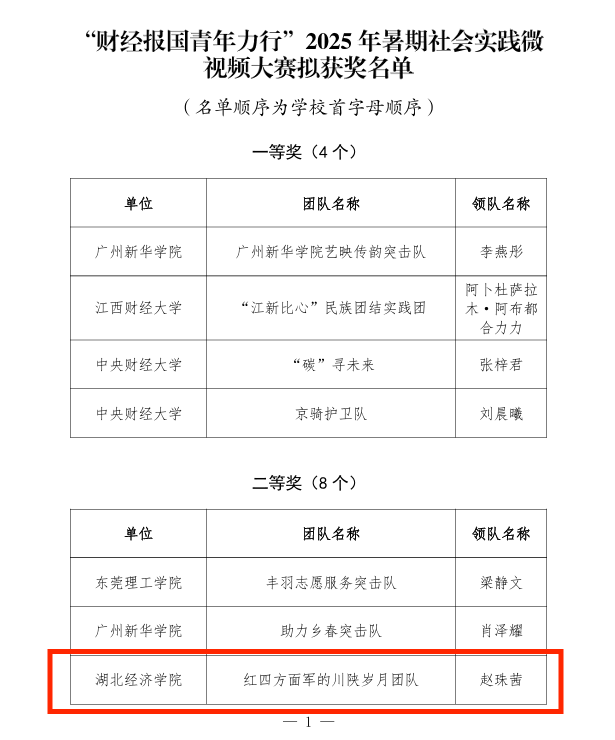 由李鸽、孙浩老师指导的“红四方面军的川陕岁月团队”(团队编号:F004)作为爱国主义教育实践团的代表,赴四川省巴中市开展实践活动,取得了突出成果。团队在实践期间获得了8篇媒体报道,其中包括《老员工云报》等国家级媒体2篇,通江县人民政府官网等县级媒体4篇,校级媒体2篇。团队荣获“暑期社会实践优秀团队三等奖”,团队成员赵珠茜同学被评为“暑期社会实践标兵”。此外,该团队的作品还获得全国“财经报国青年力行”微视频大赛二等奖,充分展现了公司学子的爱国情怀和实践能力。