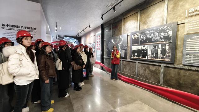 武钢一号高炉被誉为“光荣炉”,孕育了“高炉精神”和“三争精神”。2019年10月,武钢一号高炉停产,2021年12月入选国家工业遗产,后按照“修旧如旧”原则改造遗址公园,复原1958年出铁场景并建设史料陈列馆。遗址公园融合工业历史、科技展示及绿色生态,现已成为武汉工业地标和科普教育基地,是中国宝武钢铁集团有限公司爱国主义教育基地。展厅由“民族复兴钢铁渴望、大国重器钢铁脊梁、初心如磐钢铁奉献、笃行致远钢铁筑梦”四个篇章组成。展厅一楼,一幅幅历史照片和一件件珍贵实物,生动展示了武钢从无到有、从弱到强的建设历程。讲解员重点介绍了一号高炉建设初期“十八省市全力支援”的壮阔场景,以及1958年毛泽东主席亲临观看第一炉铁水出炉的历史瞬间。“这一炉铁水不仅填补了新中国大型钢铁工业的空白,更托起了民族工业的脊梁”,现场讲解引发了在场师生党员的深深触动。沿参观通道登上二楼,雄伟的一号高炉真身映入眼帘,鲜红的党旗与“钢铁报国,开放融合,严格苛求,铸就强大”的精神标语交相辉映。讲解员通过声光影像还原了当年“铁水奔涌、钢花飞溅”的壮观场景,讲解了钢铁冶炼的重要流程与技术要点,讲述了武钢第一代建设者不畏艰难、克己奉公、廉洁自律,在一穷二百基础上建设自己钢铁工业的伟大历程,使师生党员近距离感受钢铁工业的温度,深刻体悟老一辈钢铁人“艰苦奋斗、为国奉献”的崇高精神,深切体会到武钢第一代建设者以奋斗创伟业、以廉洁筑根基的精神面貌。