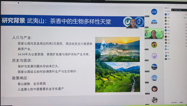 报告以武夷山案例为核心展开,系统呈现研究设计与主要发现。在研究方法上,主讲人介绍了从政策与文献梳理到田野访谈、再到扎根理论编码建模的完整路径,通过半结构访谈与理论抽样获取一手资料,并在编码过程中强化一致性把控,以提升研究的解释力与可靠性。研究结果表明,社区居民对生态的理解并非抽象概念,而是与生产经验、家庭生计与风险预期紧密相连。围绕茶产业的生态化转型,茶农在传统知识与现代管理之间形成了差异化的理解与实践方式,既包括延续性较强的传统生产逻辑,也包括在政策倡议与市场规则影响下逐步形成的标准化、精细化管理实践。报告进一步讨论了产业品质、成本与风险结构变化,以及不同利益相关者互动对转型路径的影响,从而揭示生态治理与生计选择之间更为细腻的耦合关系。