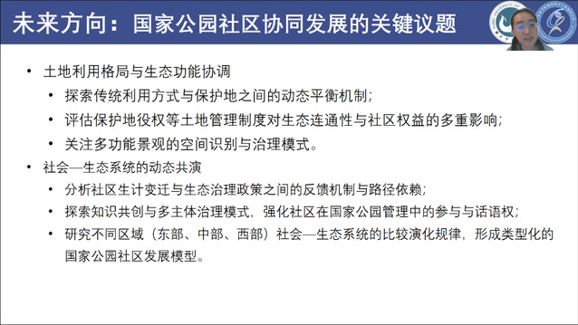 在讨论部分,主讲人将案例放入社会—生态系统治理框架中,强调国家公园制度变革会带来资源获取约束、市场波动与自然风险叠加等不确定性,仅依靠单一补偿或短期项目难以形成稳定激励,需要以适应性治理方式把地方知识、产业链条与多维福祉目标更好纳入保护规划。报告同时引入保护地役权等制度工具的比较视角,提示在集体土地等情境下,可通过契约化安排强化用途管控与生态绩效,并结合钱江源相关实践讨论其实施条件与支持体系。