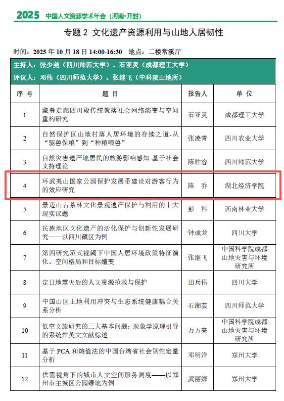 在专题研讨环节,陈乔副教授在专题二“文化遗产资源利用与山地人居韧性”分会场作了题为《环武夷山国家公园保护发展带建设对游客行为的效应研究》的学术报告。报告从自然保护地与旅游发展协同的视角出发,结合实地调研与数据分析,探讨了国家公园周边区域保护性开发对游客行为的影响机制,为山地人文资源的可持续利用提供了实证参考,引发与会者的积极讨论。
