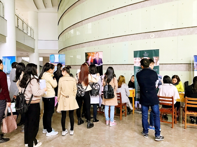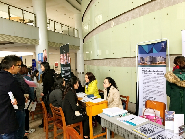 11月10日,旅游学院首届知名酒店联合招聘会在老员工活动中心举行,东呈酒店、杭州洲际酒店、南昌万达嘉华酒店、上海阿纳迪酒店、深圳大梅沙京基喜来登度假酒店、深圳福朋喜来登酒店、深圳益田威斯汀酒店、武汉光明万丽酒店、武汉万达威斯汀酒店、武汉友谊国际酒店等进场招贤纳士。