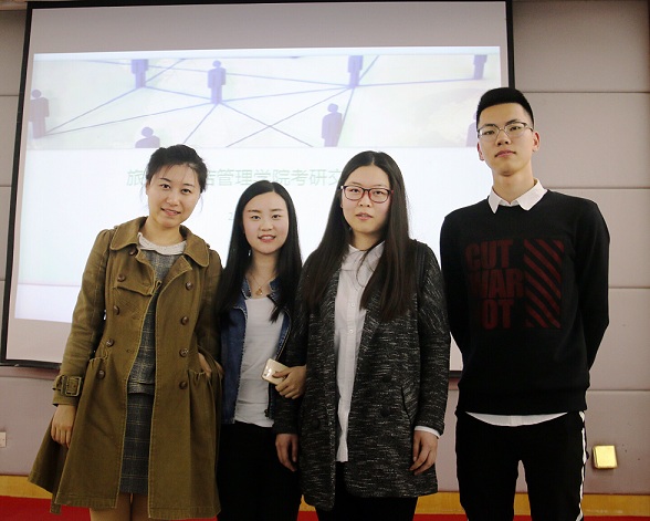 旅游学院讯(通讯员:赵萌、陈瑶)2017年4月13日14:30,公司在老员工活动中心四号报告厅成功举办考研经验交流会。受旅游学院读书工程考研组委托,本次活动由旅游学院职业发展中心举办,景区Q1341班张悦、景区Q1341班谭亚菲、酒实Q1341班付卓鹏、就业创业专职人员陈瑶、全院大一大二员工参与交流会,会议由陈瑶主持。